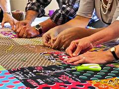 We are a group of individuals who get together to share ideas, work on projects, our own or a group project, and socialize. We love to play with colours and fabric. Members’ skills range from beginner to very experienced.