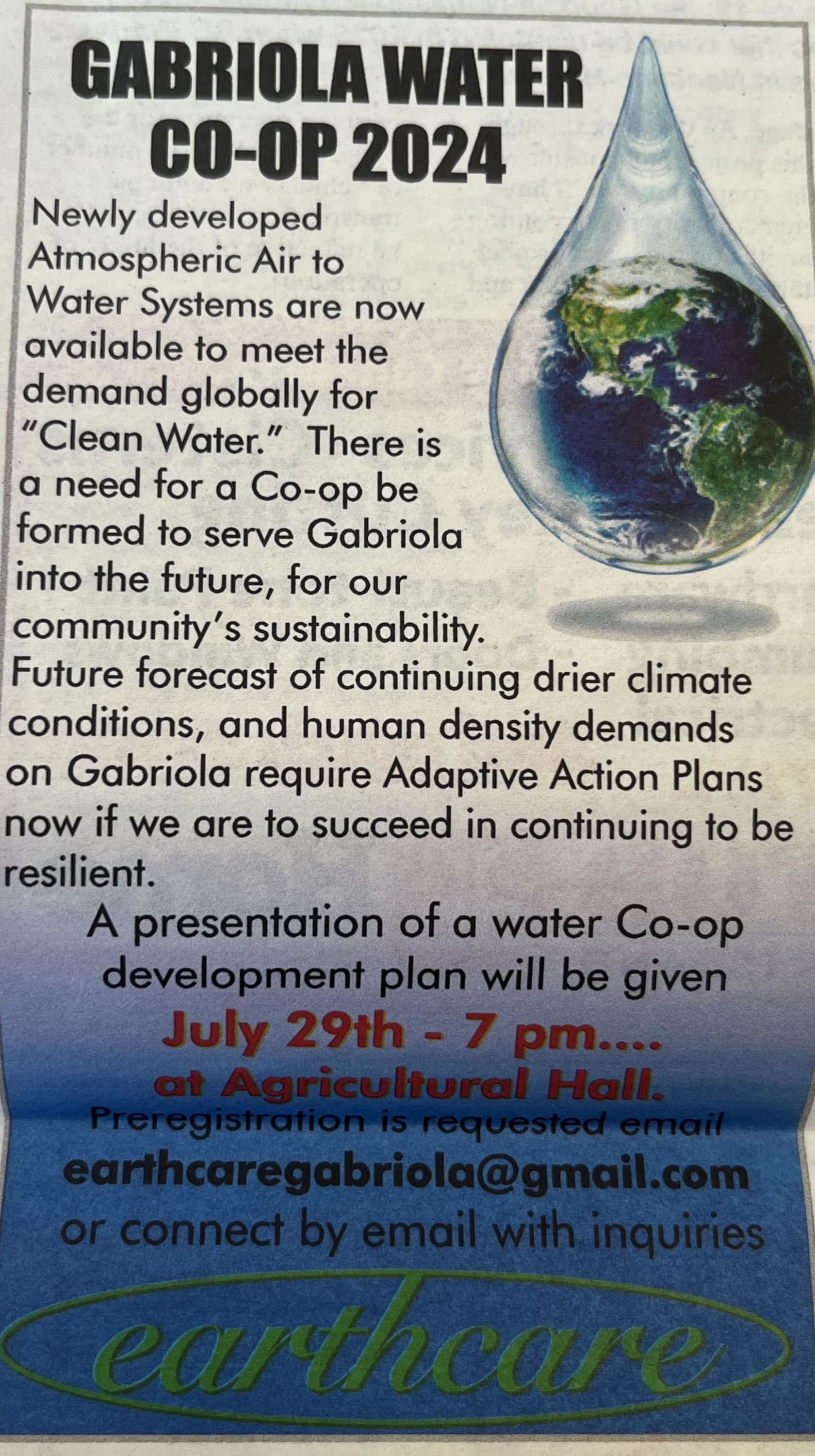 Newly developed Atmospheric Air to Water Systems are now available to meet the demand globally for 'Clean Water.' There is a need for a Co-op be formed to serve Gabriola into the future, for our community's sustainability. Future forecast of continuing drier climate conditions, and human density demands on Gabriola require Adaptive Action Plans now of we are to succeed in continuing to be resilient.