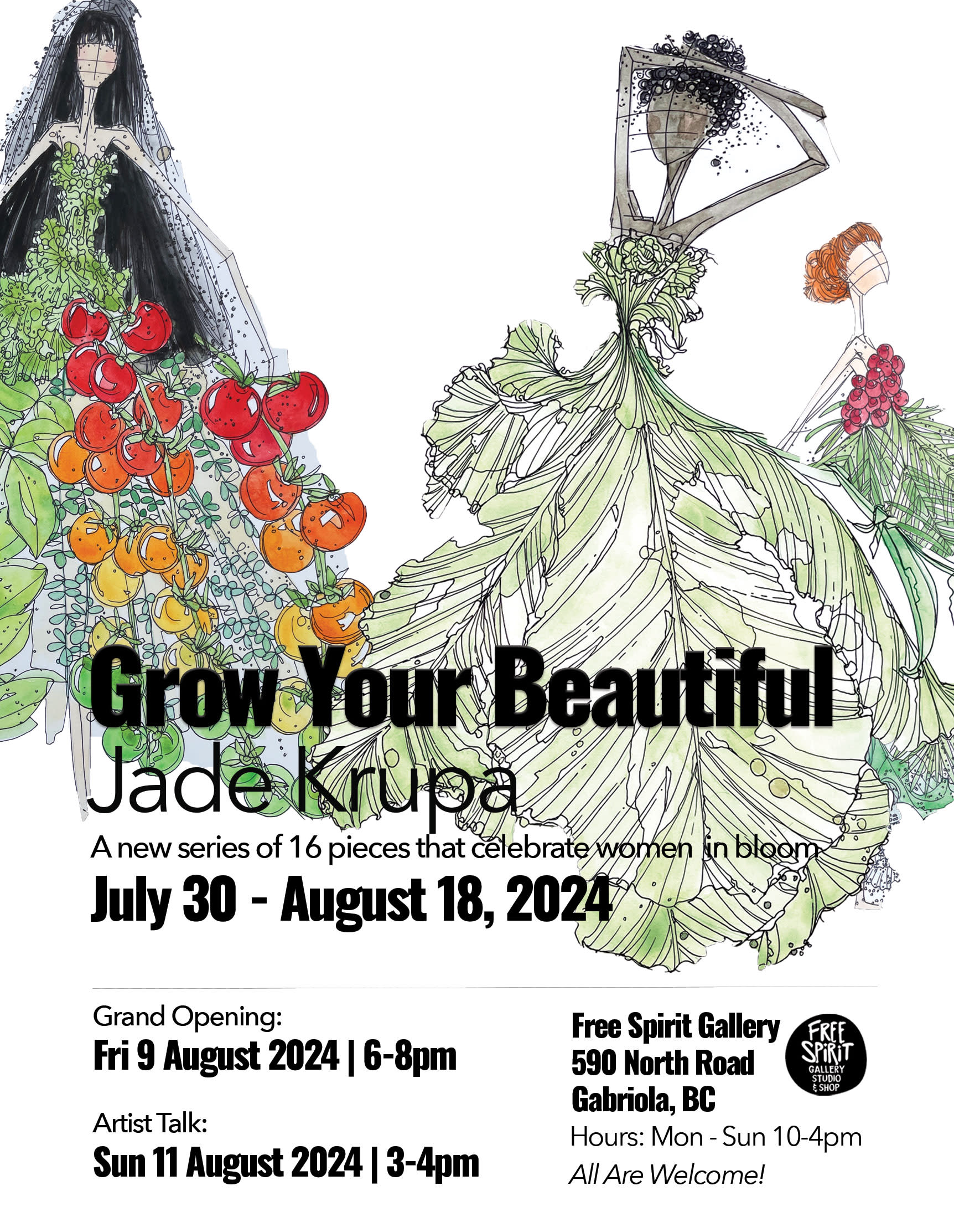 Free Spirit Gallery is pleased to announce GROW YOUR BEAUTIFUL featuring Jade Krupa's newest full collection of women in full plant inspired regalia. All pieces are 18"x24" framed and reflect a spirit of empowerment in female form. Her mixed media, energetic approach is fresh and full of vitality! Jade's work continues to evolve as she takes risks in her subject matter and themes. Her use of mixed media is always diverse and experimental from charcoal to watercolour, acrylic to ink and even tea water. Her spirit for life, her natural environment and her art is uplifting.