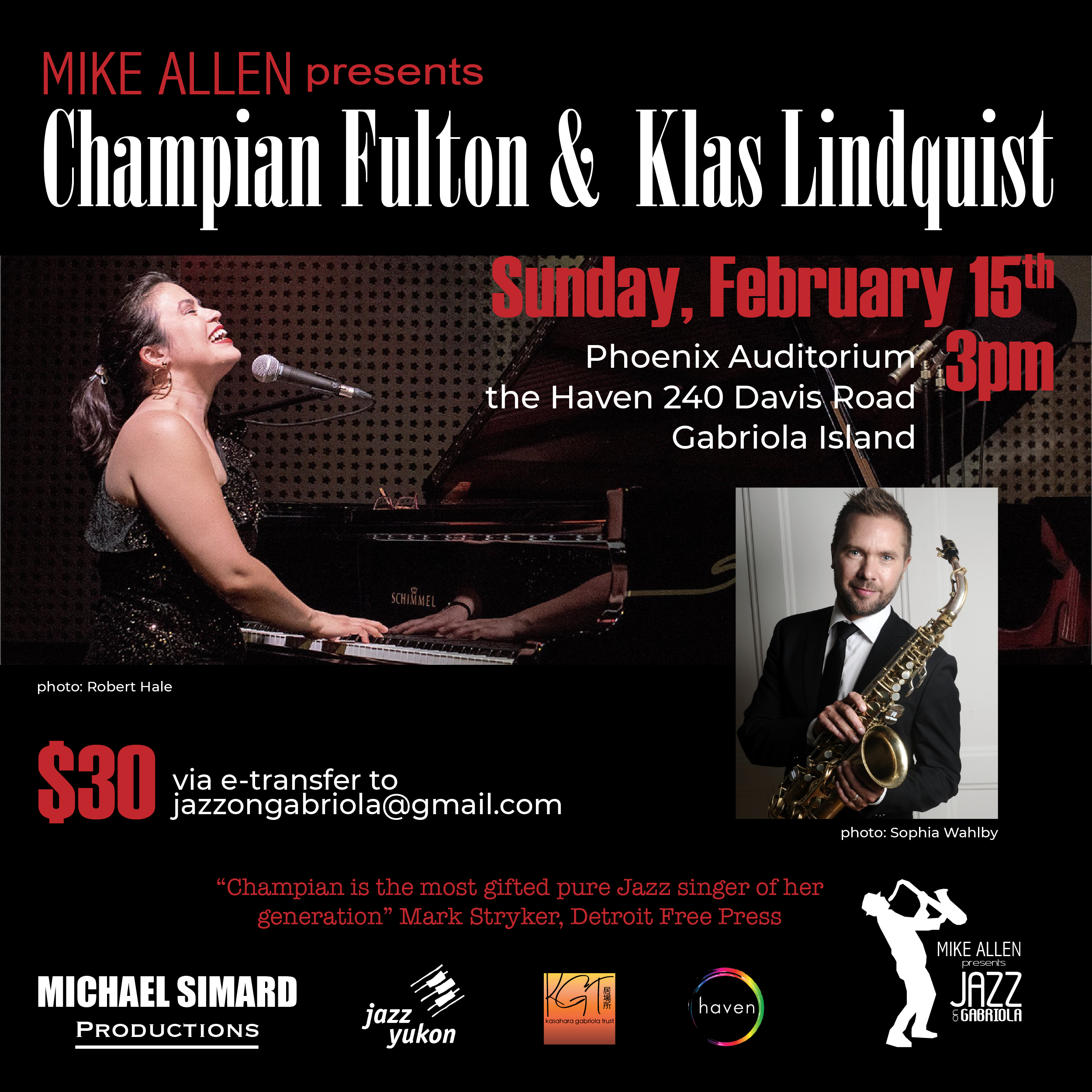 Tickets are $30 available via e-transfer to jazzongabriola@gmail.com or at the door.