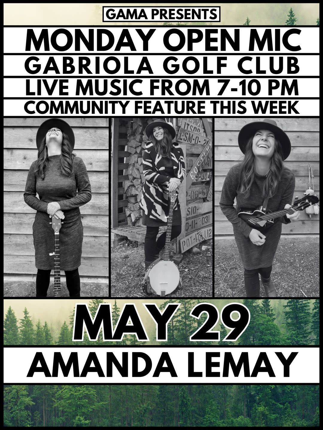 MAY 29 Monday Open Mic | Music 7 - 10 Feature Act: Amanda Lemay With country roots and a hippy heart, Amanda is a nomadic ‘Joy Facilitator’ whose path keeps leading her back to Gabriola. Expect a mix of covers and originals on guitar and banjo that range from sweet and silly to pithy and potent!