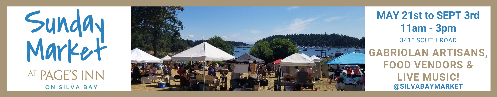 - The Sunday Markets are held starting on the May long weekend, every Sunday through the summer from 11am to 3pm, on the lawn at Page’s Inn on Silva Bay.