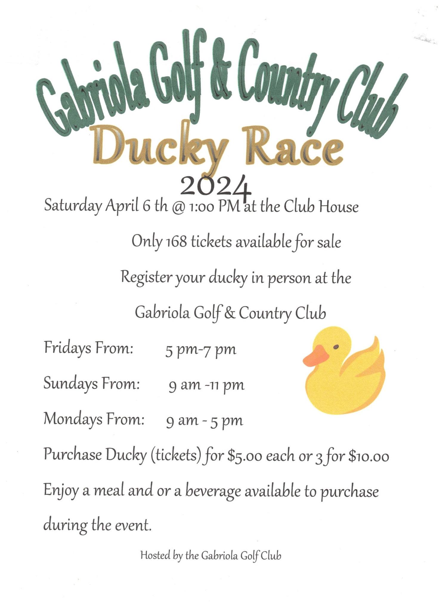 The Ducky Race is set for April 6, 2024. Come on down to the Clubhouse and buy your Ducky. There is a limited amount of them, so don't wait as they will sell out before the event.