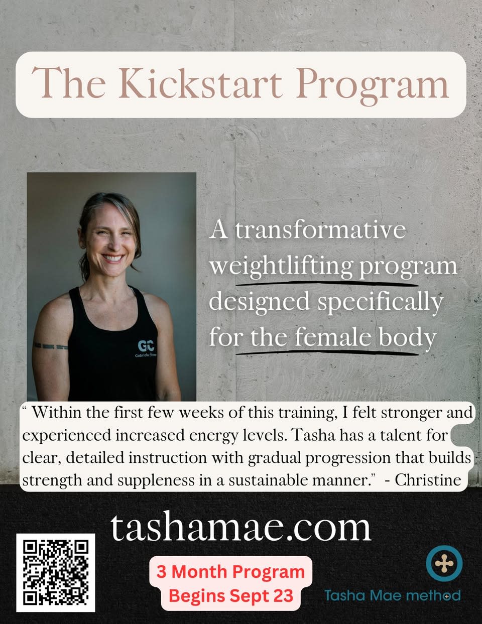 The Kickstart Program is HOME BASED and a longer program (2x per week for 12 weeks) so there is more time for Tasha to work with you personally. The course is more in depth with pelvic health, pelvic floor strength, and developing a stronger foundation with weightlifting routines and form.