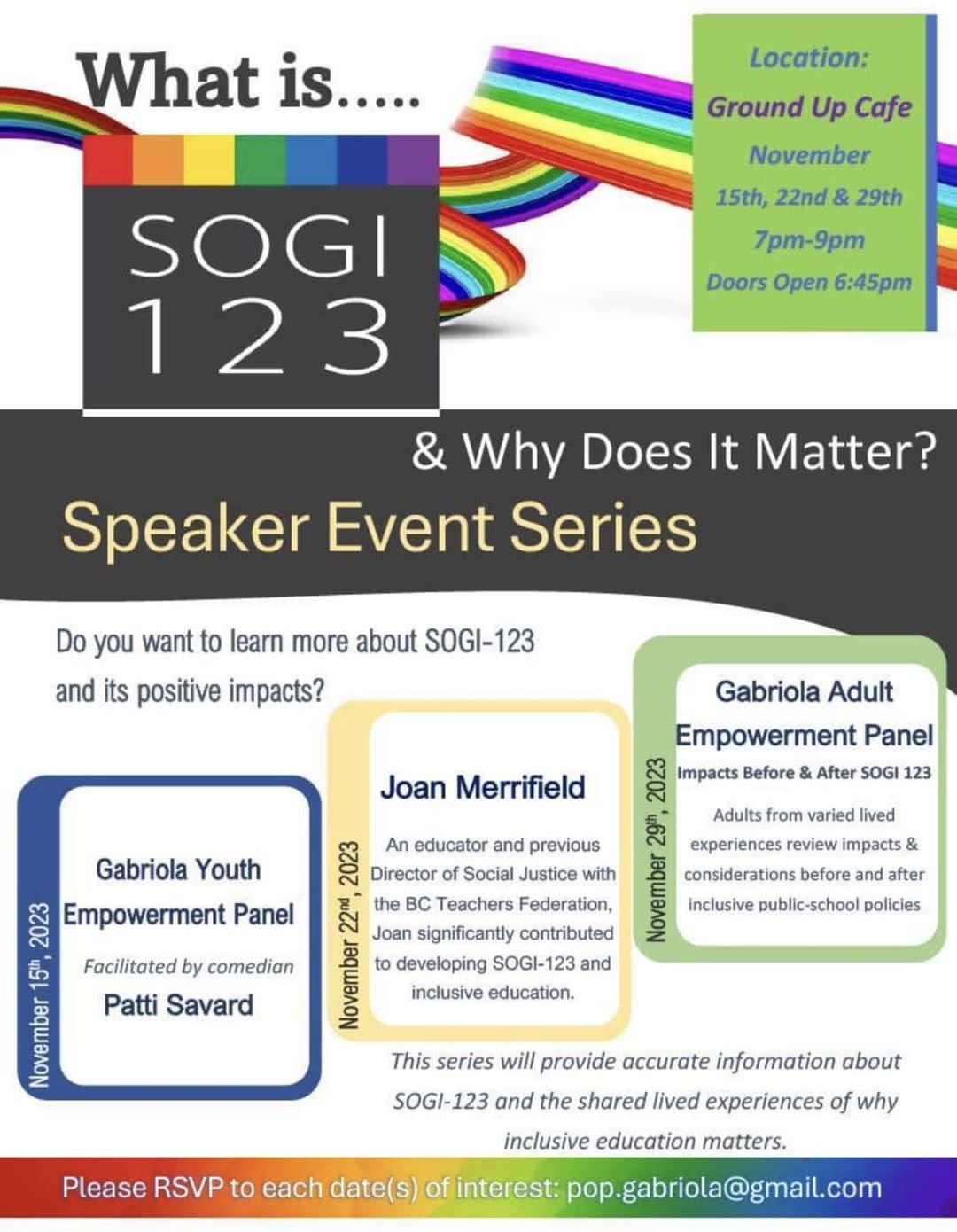 This event is organized and delivered by Gabriola parents, allies and residents with lived experience as well as content experts in the development of policies and implementation of SOGI 123. Each session will also have time for safe and respectful community dialogue related to SOGI 123’s practices and impacts. Please come out and share in the learning and community discussions! Space will be limited and we kindly ask that persons interested in attending one or multiple sessions RSVP with each individual date of interest to attend (Nov 15th, 22nd and 29th): RSVP: pop.grabiola@gmail.com We respectfully acknowledge these events take place on the unceded traditional territory of the Snuneymuxw people and the traditional keepers of their land.